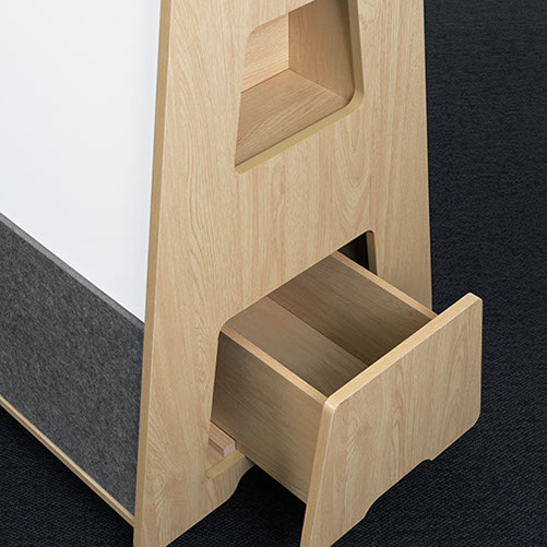 The IdeaBoard is a mobile multi-functional storage whiteboard. Featuring an A-frame design in a wood finish, the IdeaBoard will be a great addition to any classroom. Offering two large writing surfaces and a magnetic receptive acoustic pinboard base. Store away tools and accessories in the side drawers and storage cubby holes.